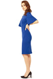 This bell sleeve dress features an open back with button keyhole. Pencil skirt and hidden zipper.