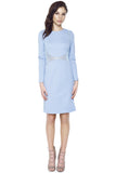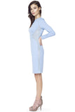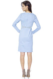 Ponte dress with contouring mesh panel creating an alluring curve from shoulder to hem.