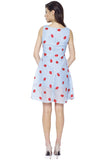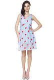 This fit and flare dress features embroidered lips for a playful accent. A full skirt cuts a flirty profile with illusion hem.