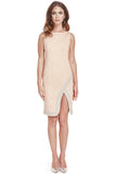 A sleeveless classic, this pontes sheath dress features wrap skirt with front slit and contrasting banding.
