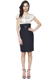 Two-tone cascade ruffle dress with layered collar that floats over a stream-lined waist. Wool pencil skirt with skinny black belt and signature V-seam at back.