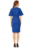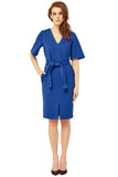 This ponte dress features a V-neckline and Obi-tie waist belt. Pencil skirt with front slit and side pockets.