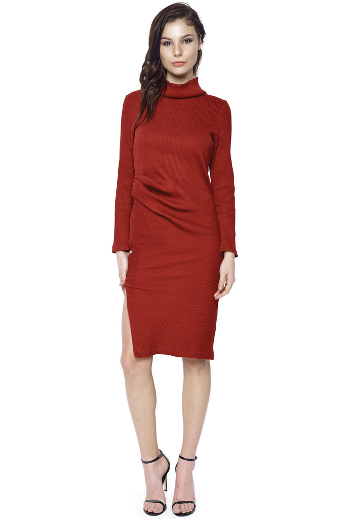 Crafted from stretchy ribbed-knit, this curve hugging dress is the perfect sweater dress. From the turtleneck, to ruched waist and side split zipper detail, this dress is a show stopper.