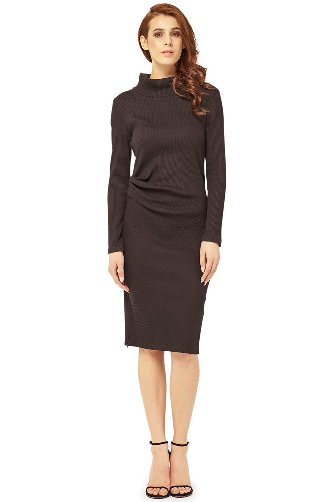 Crafted from stretchy ribbed-knit, this curve hugging dress is the perfect sweater dress. From the turtleneck, to ruched waist and side split zipper detail, this dress is a show stopper.