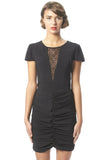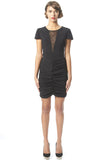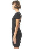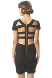 The artful ruching combined with edgy cage back ensure this dress to be a sensational evening choice. The contrasting mesh V panel adds textural appeal to this matte jersey dress. Dress is double layered with exposed zipper at back.