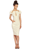 Nothing says look at me like an unexpected exposed back. Ponte dress with caged back, detailed cut-outs at neckline and pleated capped sleeves. Skirt is a tailored pencil fit with twin front pockets. Top is lined with exposed zipper at back.