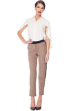 Ponte cigarette pant with slash pockets and rear welt pockets. Contrast waist and side panels.