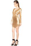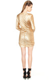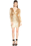 Sultry, form-fitting long sleeve dress featuring a plunging V neckline and metallic sequins. Shirring cinches the waistline and the sides of the hem.