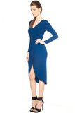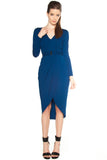 A classic V neck dress that drapes elegantly into a tulip skirt. Features an exposed gunmetal back zip and matching elastic belt.