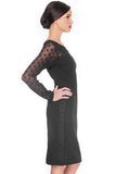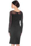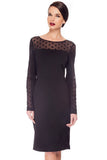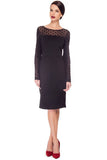 Polka dot sheer mesh adds sultriness to this classic sheath dress. This dress features an illusion neckline and long sleeves with mesh detailing.